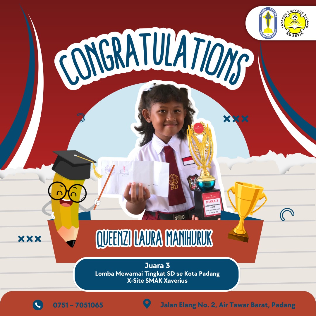 Queenzi Laura Manihuruk, siswa kelas II SD Setia, berhasil meraih Juara 3 Lomba Mewarnai Tingkat SD se-Kota Padang.