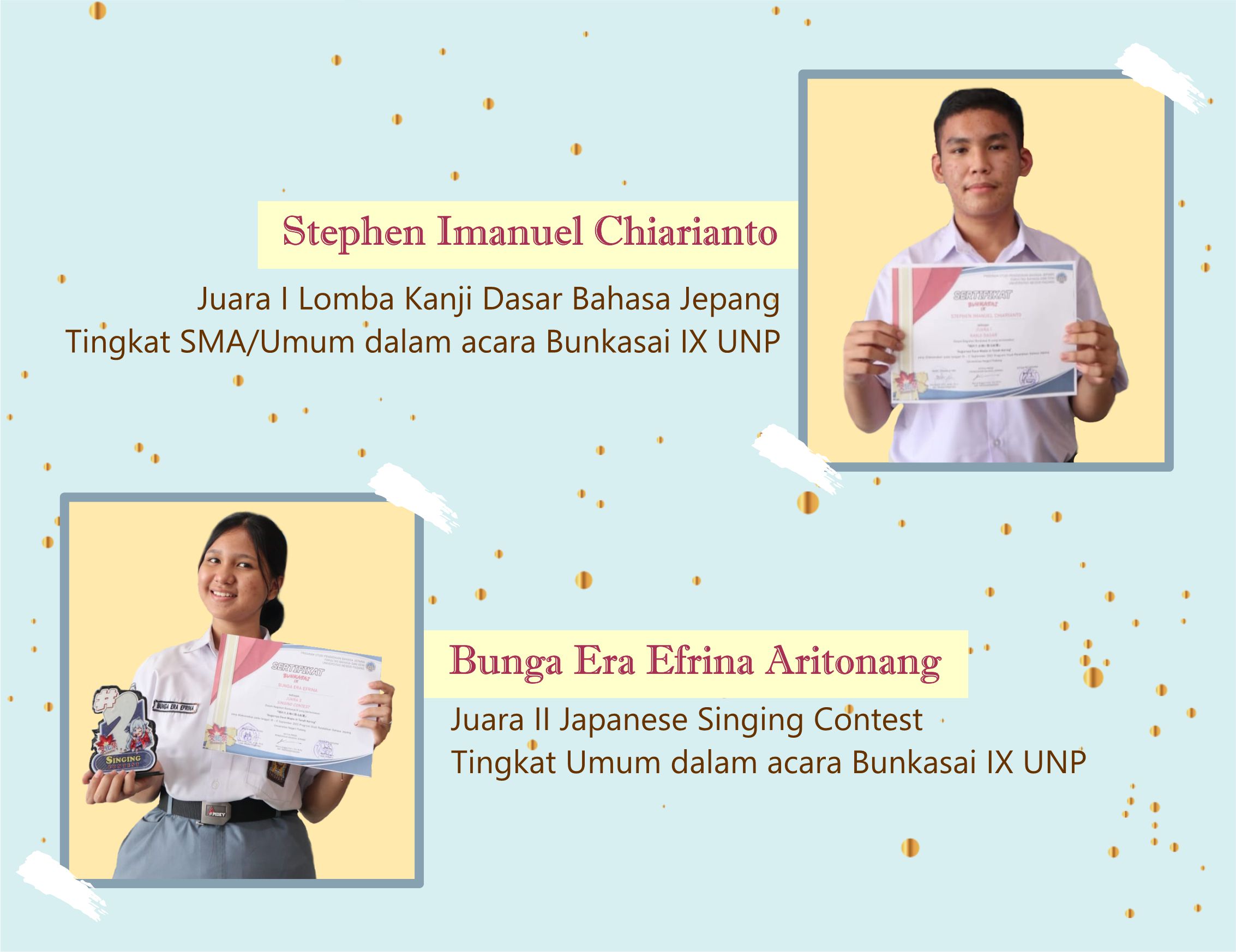 Selamat kepada Peserta Didik SMA Katolik Xaverius Padang yang telah berhasil mendapatkan juara dalam acara Bunkasai IX UNP. Stephen Imanuel Chiarianto mendapat Juara I Lomba Kanji Dasar Bahasa Jepang Tingkat SMA/Umum dan Bunga Era Efrina Aritonang mendapat Juara II Japanese Singing Contest Tingkat Umum. Tetap semangat mengukir prestasi.